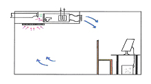 室內的風(fēng)機盤(pán)管工作時(shí)吸入一部分由風(fēng)柜處理后的新風(fēng),再吸入一部分室內未處理的空氣經(jīng)過(guò)工藝處理后,由風(fēng)口送出能夠吸收室內余熱余濕的冷空氣,使室內溫度濕度達到所需要的標準,如此循環(huán)工作。(如圖所示:)